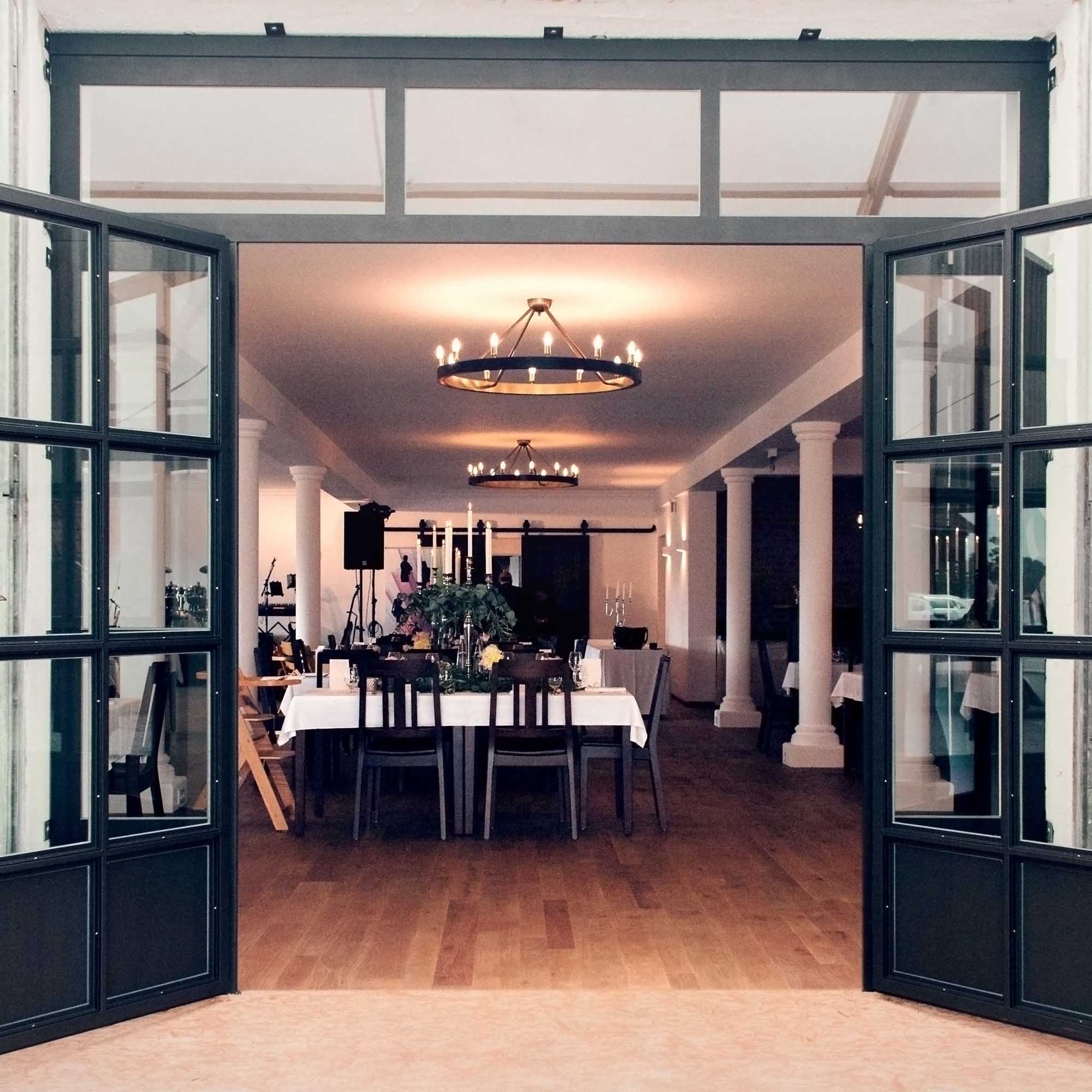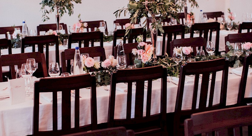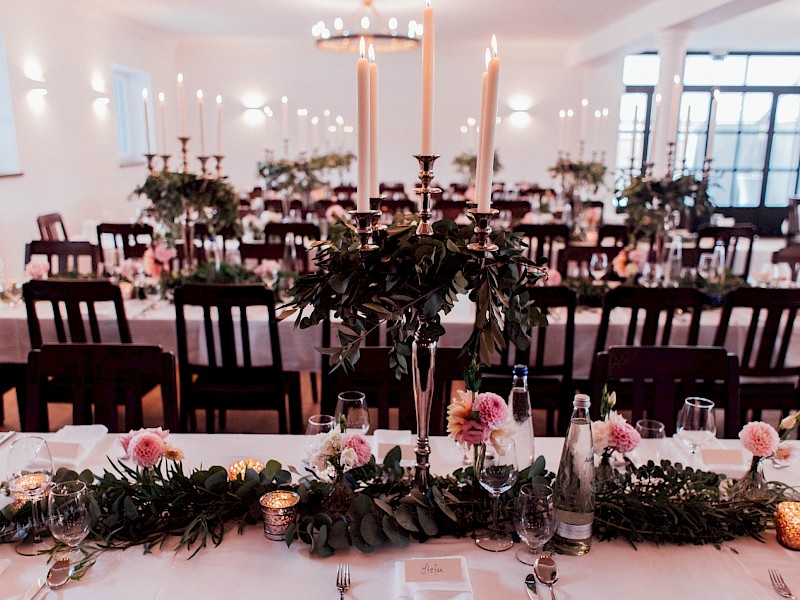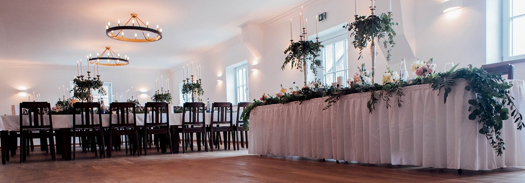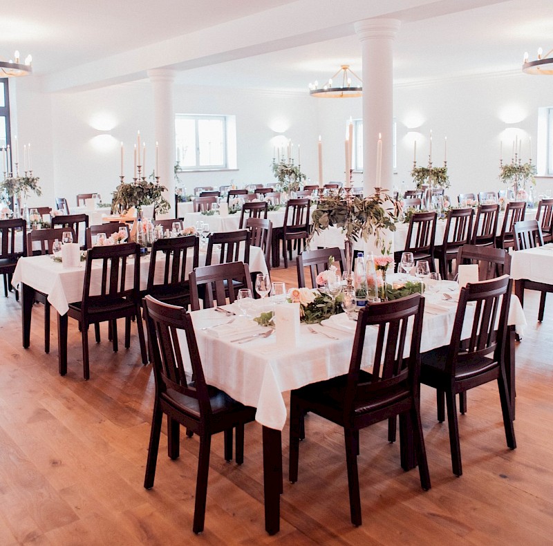Wir begrüßen Sie recht herzlich im Hofsaal! Sie können den Saal schmücken und dekorieren, wie es Ihnen beliebt. Aber auch ohne viel Dekoration strahlt der Raum durch seine Säulen, sein neues Holzparkett, ein Beleuchtungskonzept aus Kronleuchtern und Retro-Lampen und eigens angefertigten Stühlen und Tischen.