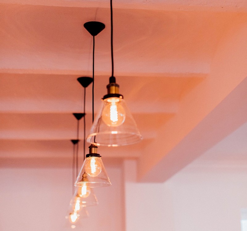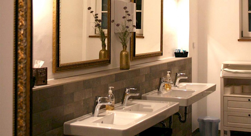 Kronleuchter und moderne LED-Lampen im Retro-Style sorgen für homogenes, warmes Wohlfühllicht im Hofsaal.